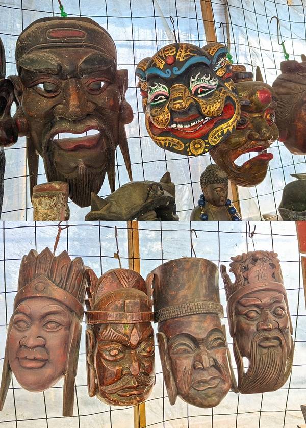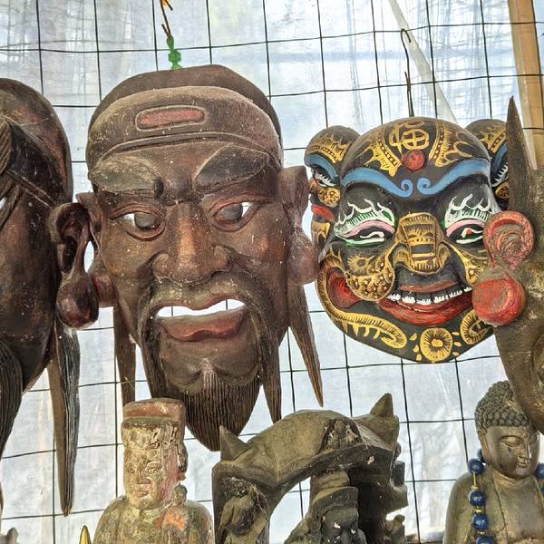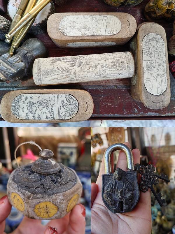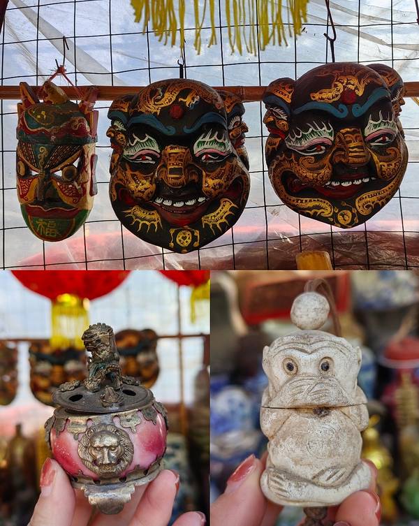 不同于桂林的墟场,这里更像武汉的户部巷,青岛的劈柴院,苏州的山塘街,杭州的河坊街,成都的宽窄巷子,北京的南锣鼓巷。最有意思的是山水园外面的旧物摊,各种有趣的文玩,如傩面具、鼻烟壶、脂粉盒子,差点入手了。