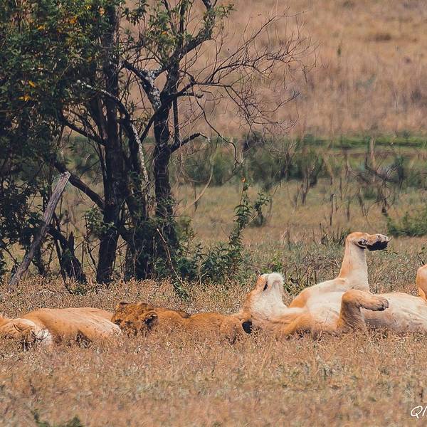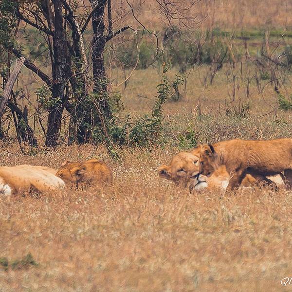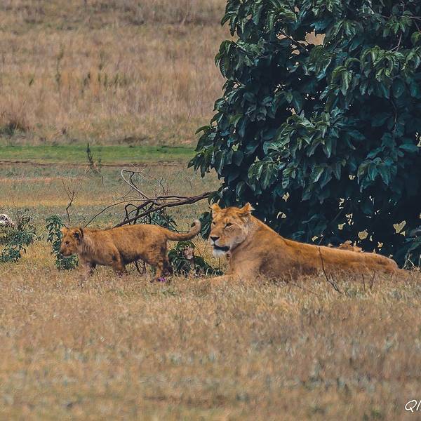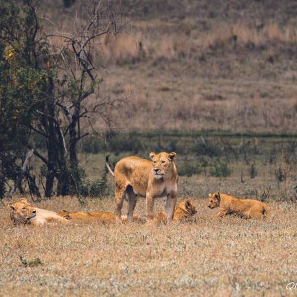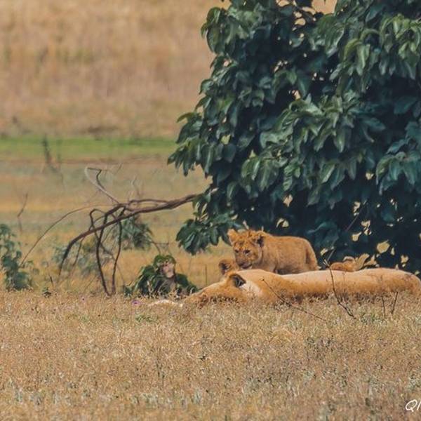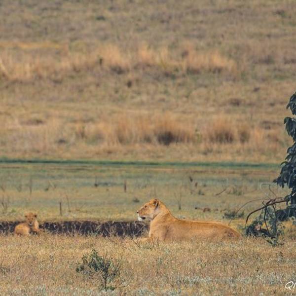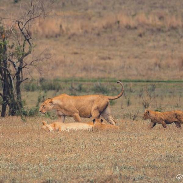 远处一块乌云盖过来,一到三月是短雨季,阵雨时不时的会光临。Saba看到雨水的预兆特别兴奋,you are lucky!you are lucky!他不停地叫唤。我们来的这两天沙尘特别厉害,空气干燥,草木都覆着土色,草原看着像被沙化了一般。不稍一会,大雨倾盆而下,Saba让我们赶紧盖上顶上的盖子,草原上的雨水混着空气里的沙尘,像泥一样的往下砸。动物们排成一溜,背着雨,整齐的或站或坐。雨水来的快,去的也快。雨后沙退了去,整个草原露出了本该有的颜色。一个狮群栖息在遥远的草原中央,恩戈罗恩戈罗保护区规定不得离开大路,车轮不得碾压草原。吃力的摆弄着长焦镜头,来非洲带什么镜头好?越长越好。爸爸总是在不远处守望着。(这个爸爸好帅啊!给99分)