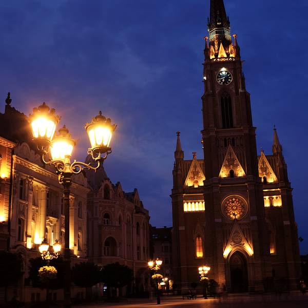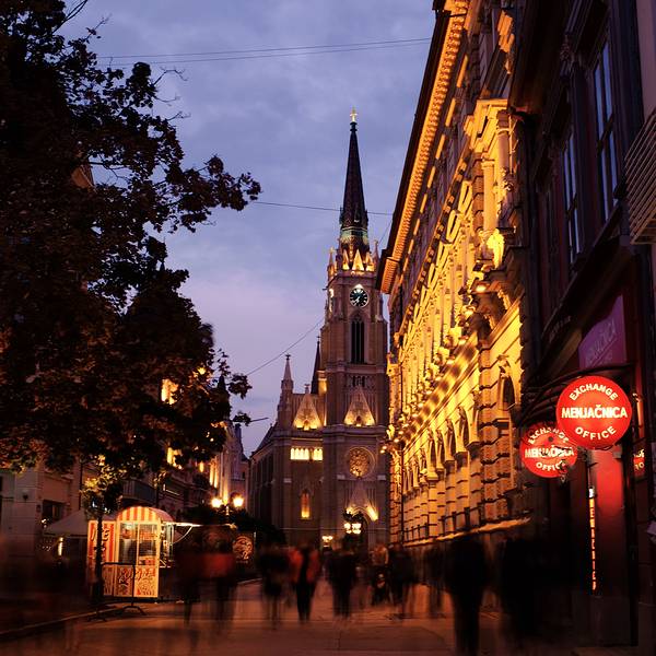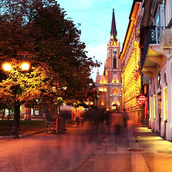 诺维萨德最热闹的地方就是位于城中心的自由广场了。因为位于城中心,所以自驾的朋友建议把车停在酒店,打车前往,城中心是完全禁止停车的,并且整个广场都是步行街,机动车辆不得驶入。 我们去的时候刚好华灯初上,这大概是诺维萨等最美的时刻。入夜后的气温还是很低的,但也抵挡不了前来逛街的游客,你会发现在路灯下的长椅上坐着很多人,有的是谈恋爱的情侣,有的是休息的老人,还有带着孩子的家庭。这里不仅仅是周末休闲的好去处,也是当地购物的中心区域。在整个广场区域有很多纪念品的贩售摊位,也有服装店,还有餐厅,不过大部分都是以美式快餐为主。 往里走走,可以找到一条酒吧街去,即使是微凉的夜晚,很多人宁愿穿着羽绒服,裹着围巾也要坐在户外喝酒聊天。 因为去的时候已经是晚上了,教堂已经关门,所以如果你想参观的话最好白天来。不过我本身对教堂兴趣不大,所以并没有失望。 诺维萨德虽然知名,但毕竟不如贝尔格莱德名气那么响亮,所以这里的物价比首都还要便宜,尤其是餐饮,可谓量大价优,而且口味很好,主要走的是意大利菜系的风味,所以来到这座城市,一定不要吝啬,大快朵颐才是最好的品味方式。在自由广场,到哪里都能闻到香喷喷的爆米花味道,具体价格记不得了,但非常便宜,口味和我们在国内吃到的不太一样,是咸口的,也没有那么酥脆,但味道是极香,特别诱人,你一定不会放弃尝试的机会的。