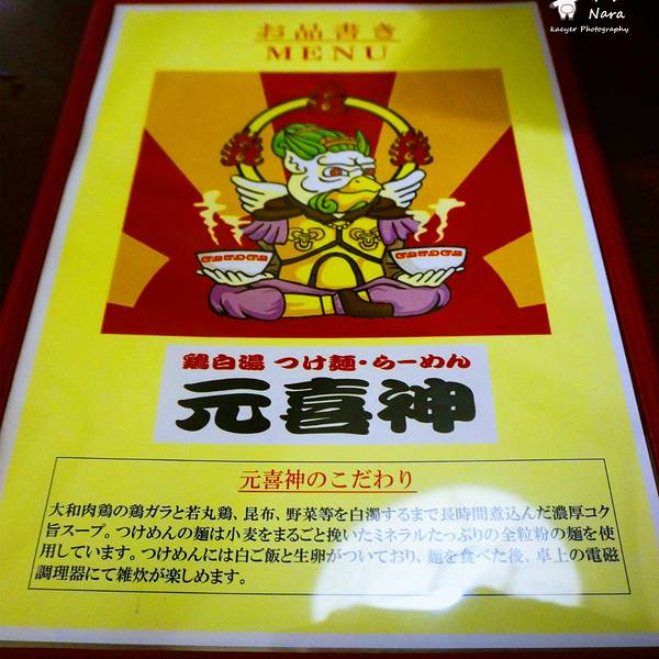 晚上一行人前去“元喜神”,在近铁奈良站附近的商业街内。附近有很多传统小店呢~也有很多萌萌哒小朋友~“元喜神”招牌是鸡白汤,非常浓郁深厚,重口味必选,浓浓的鸡汤,店里有专门的小册子介绍吃法,先将鸡汤加...晚上一行人前去“元喜神”,在近铁奈良站附近的商业街内。附近有很多传统小店呢~也有很多萌萌哒小朋友~“元喜神”招牌是鸡白汤,非常浓郁深厚,重口味必选,浓浓的鸡汤,店里有专门的小册子介绍吃法,先将鸡汤加热,加入面条和鸡蛋,吃完后再就着汤拌饭吃,味道很独特,以至于回国后念念不忘,强烈推荐!另外也试了酱油汤底的名物拉面,不过不失,喜欢清淡的小伙伴可以选择。