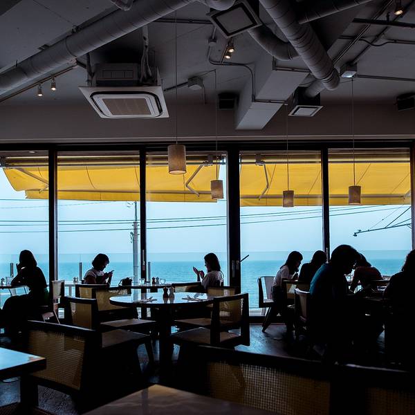 下午2点终于可以吃饭啦!!! 小伙伴找的BILLS ,也是我想去的人气网红店,来了好几次的霓虹控也推荐我,走起~地方很好找,七里滨站下车,往海边的方向走就能到,沿海的一整栋白色房子网红店的人气真当不是盖的,能看到海景的露天位置都已经满客,只有室内的沙发位,有空调也是不错的。在这里吃饭的也是日本人居多,这个隔壁桌的小男生很养眼啊黄色蓬蓬下,对着这迷人的海和冲浪的人们吃午餐,大概是再惬意不过的事了~~~ 我在这站了好一会的我很保守的点了意面,味道一般;小伙伴点了人气的crab饭,很好吃的样子;最后的这个香蕉派难吃到要死。。。。倒是咖啡还不错,就是上的时间早了,饭后吃才最好诶。。。。于是在餐食不怎么样的情况下,6000的日元,就当是为就餐环境买单了。。。海边的居民肤色也很阳光啊~ 在街边一边啤酒,一边聊天~海边开个摩托车~~好帅气~~~