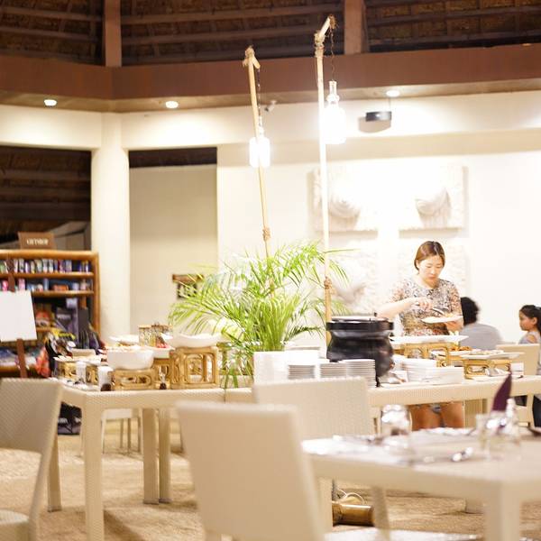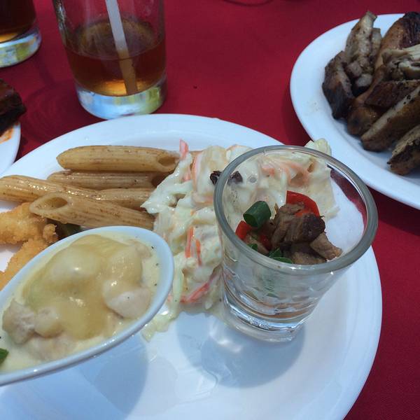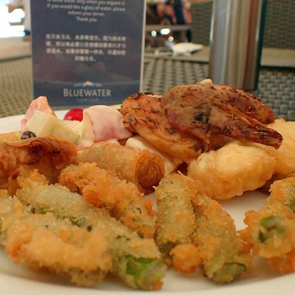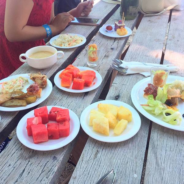 我们是早上看完鲸鲨之后去的,到的时候中午11点多,就在沙滩等自助餐开餐,烤肉的香气一阵阵飘过。中午的自助午餐以西式为主,也有live cooking的烤肉烤螃蟹。头盘、主食、点心,一应俱全。 午餐过后就在泳池旁边休息了会儿,泳池水很深,靠近边上的地方1米8的人踩不到底。