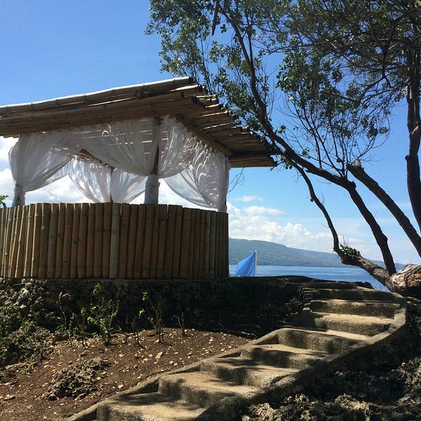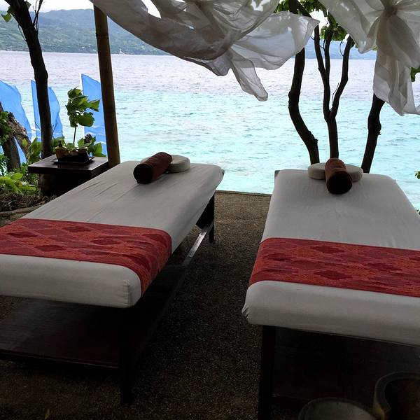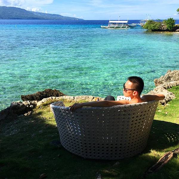 二是从宿务过来。可从宿务south bus terminal坐大巴到OSLOB,大约要四小时左右,车费150P。到了oslob可以乘坐电三轮来到sumilon blue island resort的专属码头。所以如果在宿务过来的虽然转车转船少,但时间却长了约1倍啊~这里最出名的自然是潜水啦,岛上有几个潜点。有自助餐的那个沙滩最大,浪也较为平缓,但海底世界一般。这也是上岛一日游的游客来的主要海域。我们觉得最棒的潜点是我们的客房走出来往左手边一直走,到尽头要下楼梯那个潜点。刚开始下水不觉得什么,可如果顺着下楼梯后左手边的海水一直游几十米就能见到许多漂亮的鱼,再一会就能见到好多漂亮的珊瑚~岛上的山径可以徒步~总之活动相当丰富岛上可面朝大海,享受SPA的,看看这个临海而建的SPA室很有感吧! 天然海景spa,好像1500比索一个小时起步吧。岛上还有个宁静的泻湖,可以划下船。不过船很少,最多坐3个人。温馨提示: