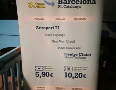 Aerobus机场大巴:A1 Aerobus: 1号航站楼开往加泰罗尼亚广场,运营时间: 6:10--01:05;A2 Aerobus :2号航站楼开往加泰罗尼亚广场,运营时间: 6:10-01:00。