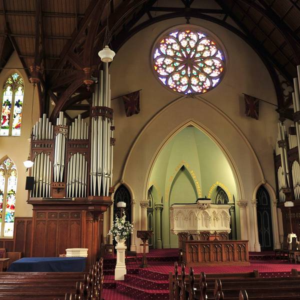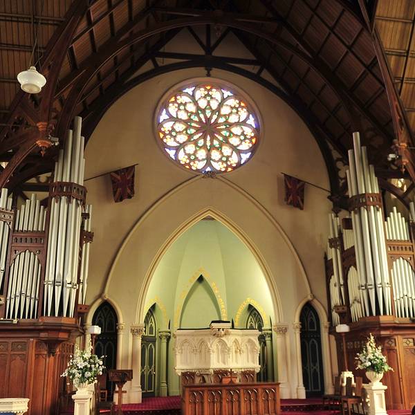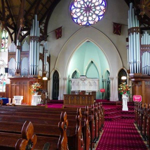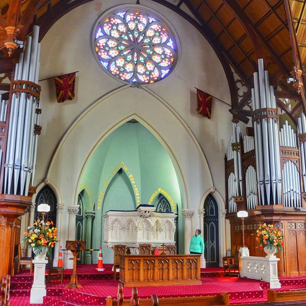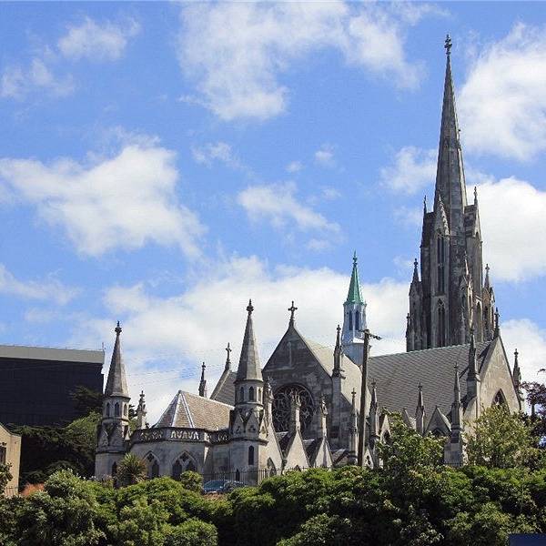 但尼丁第一教堂是苏格兰长老会教堂,建于1873年,60米高的尖塔默默诉说着宗教威严。教堂内部保有19世纪典型的长老派教会的特色,鲜艳的彩绘玻璃十分夺人眼球。而闪耀于戒坛上方的高窗,非常美丽,犹如真的花瓣,无愧于其“玫瑰窗”的美誉。在教堂56米高的钟楼上,挂着12只时钟,它们是在1975年被放上去的。另外,第一教堂内也设了个旅游服务中心,里面展示着教堂历史文物,也售卖纪念品。