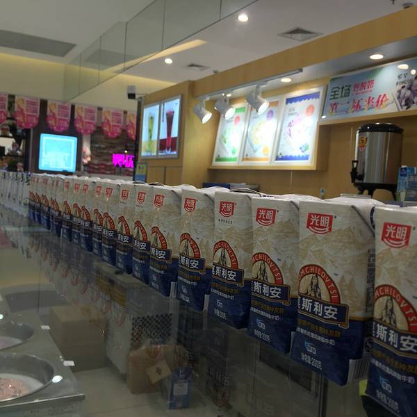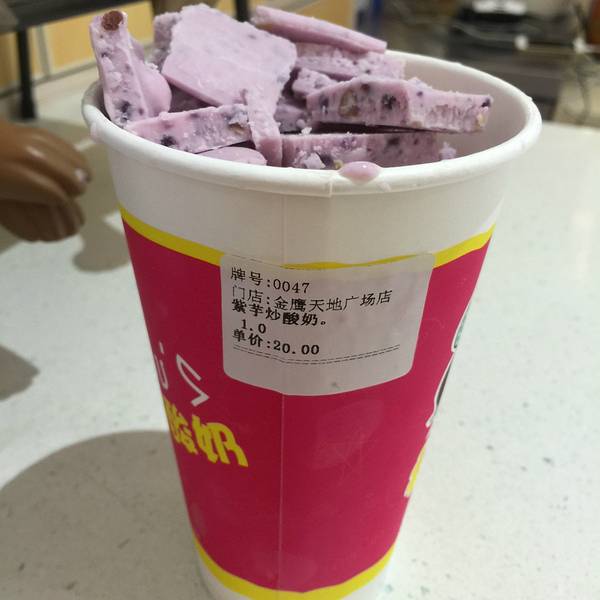 吴小姐炒酸奶,在金鹰广场的负一楼,中间的位置,周围都是卖吃的。位置好找,环境也卫生干净。炒酸奶,先是把酸奶像摊饼似得倒在锅里,然后慢慢等它凝结成块,最后盛到杯子里。吃起来一股浓郁的酸奶味,味道醇厚,里面还有葡萄干、红豆,椰果等。他家的炒酸奶口味有很多种可供选择,有芒果炒酸奶(安慕希)、抹茶炒酸奶、桃太郎炒酸奶、蓝莓炒酸奶、草莓炒酸奶、巧克力炒酸奶、紫芋炒酸奶、桂圆红枣炒酸奶。服务员服务态度热情周到,给的炒酸奶量很足,满满一大杯,扫码还送赠品。店铺整洁卫生,给人很舒服的感觉,生意挺不错。