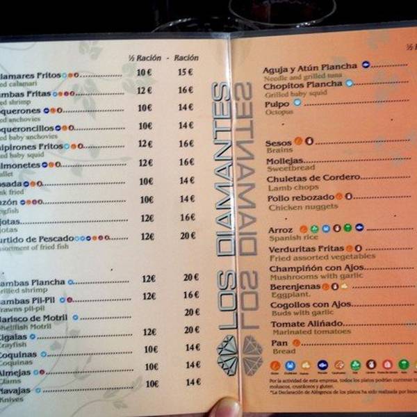 推荐指数:★★★★☆ 用Google map一搜当地人最爱,排第一的便是Los Diamantes。看小小的餐厅挤满人就知道是“笋野”啦!人多得没位置,站的人比坐的人还多,连厕所等候区都不放过,老外根本不理什么厕所不厕所的,有位置就可以放开吃。Los Diamantes的招牌菜都是炸海鲜,而且我建议大家都点大份的,小份的说是说二分之一的大份,实物只有四分之一的大份,大份是超级划算的。特意拍了餐牌,给大家参考。我们都想试试,所以点了海鲜大杂烩surtido de pescado,里面有炸蟹肉、贝壳类的肉、鱼、虾、章鱼。非常非常大份,2个人根本吃不完,不像路边摊有难闻的油烟味,海鲜外脆内鲜,吃起来很新鲜,没有千年油的味道,缺点就是非常咸。