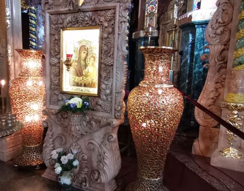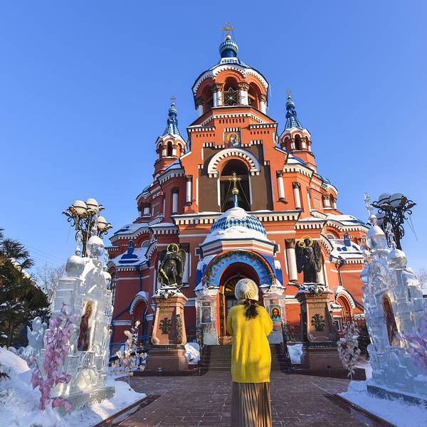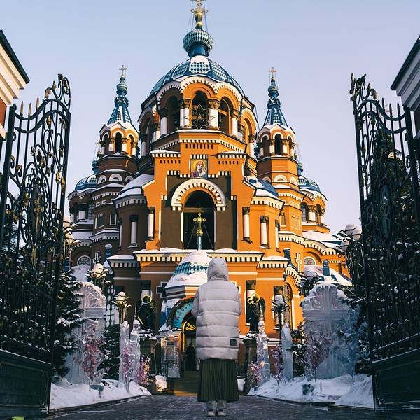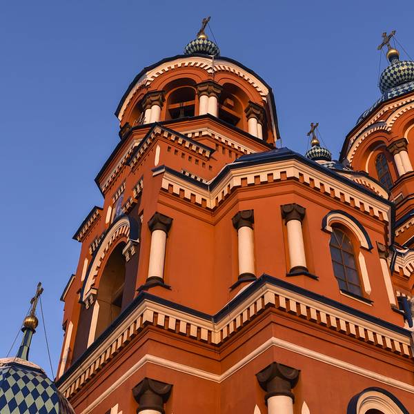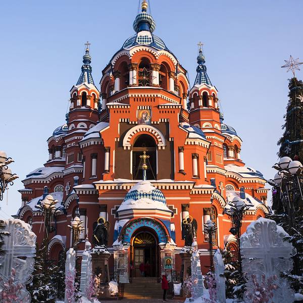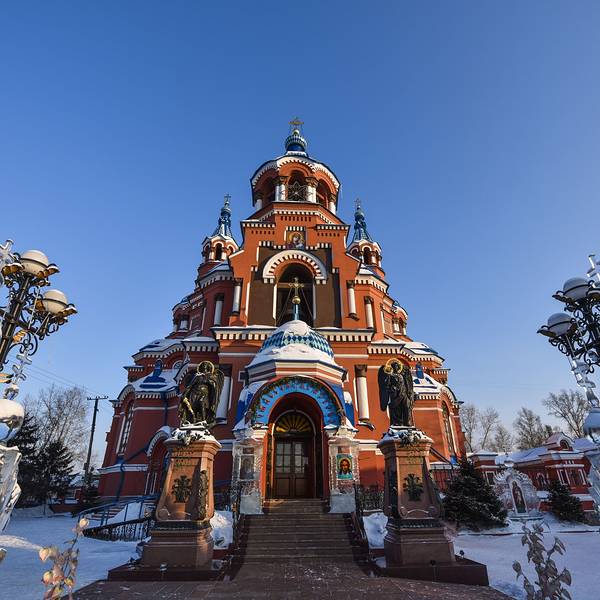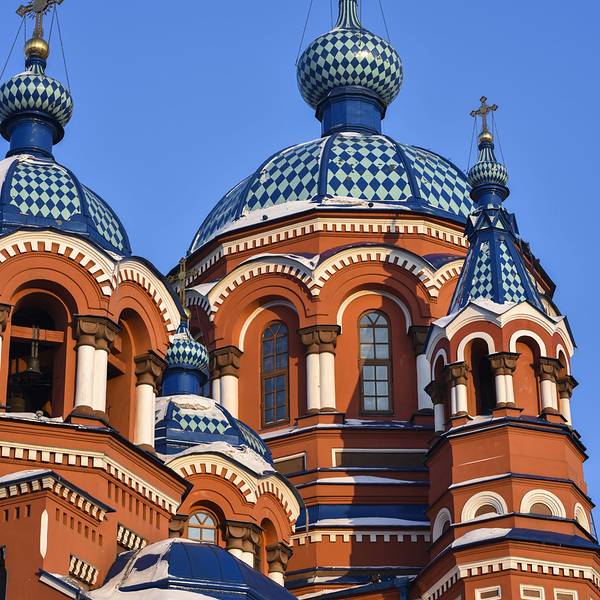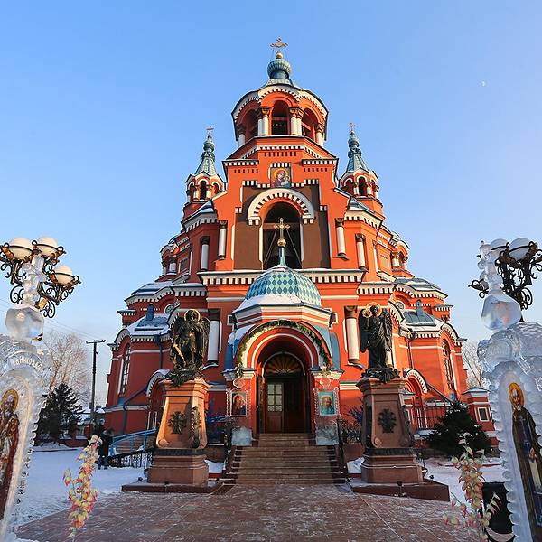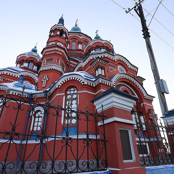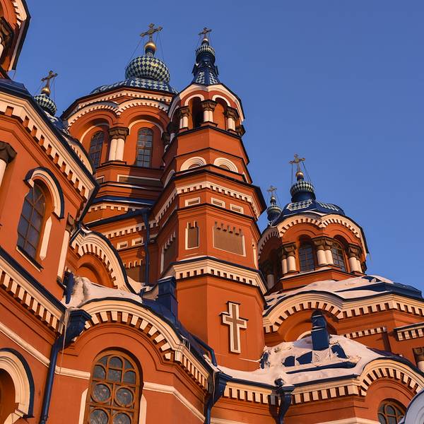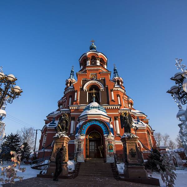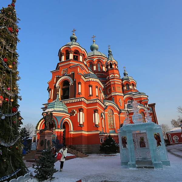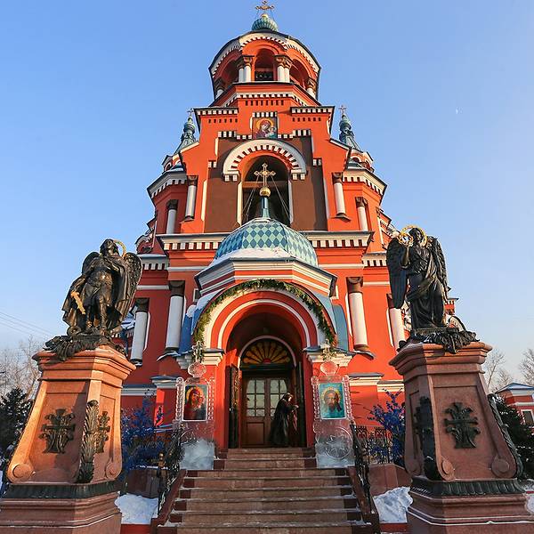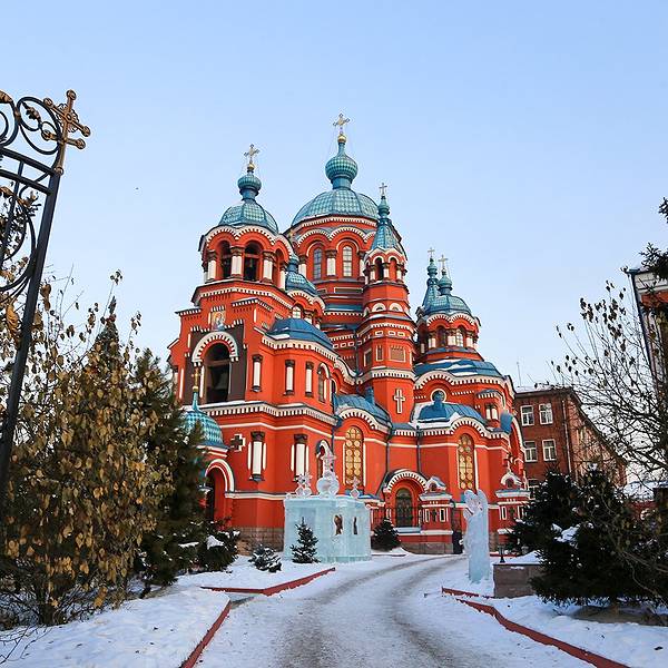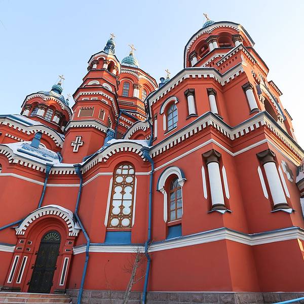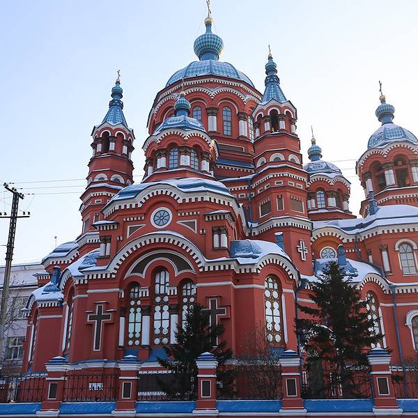 喀山圣母教堂,是伊尔库茨克乃至整个西伯利亚地区最为华美的教堂,据说在整个俄罗斯仅次于莫斯科的瓦西里大教堂和圣彼得堡的滴血大教堂。这里也是很多外国游客到伊尔库茨克的必游之地。 建筑宏伟,内饰华丽 作为一座东正教教堂,喀山圣母教堂具有典型的拜占庭式风格,浑厚的红色外墙,蓝色洋葱头般的穹顶,在西伯利亚灿烂的阳光照耀下熠熠生辉,如同童话中的城堡,极具视觉冲击力。 当你走进教堂,一定会被精美绝伦的壁画与画像所惊叹。这里处处都是令人眼花缭乱圣像画和圣人、圣徒的壁画,它们讲述着那些遥远的宗教故事。在东正教里,圣像画被称为“天堂的窗户”。 在教堂内你看不到雕像,包括巨大的“耶稣受难十字架”,这里的陈列以壁画与画像为主,俄罗斯民族早期一直处于动荡地迁徙中,与雕像相比,画像更加具有便携性。 虚幻般的神圣世界 天气晴朗的日子里,每到下午16点左右,阳光会从窗户中透进来,光束犹如圣光,教堂的内部被一片明亮的金色所笼罩。当地的信徒们在这里点烛祈祷,在这样的氛围里,人们的心不由得沉静下来。 俄罗斯人的保护神 几个世纪以来,喀山圣母一直被视为俄罗斯人民的保护神。在俄罗斯的许多城市,都有同名教堂。眼前的这座教堂,始建于1885年,于1892年完工。 由于战争和人为破坏,俄罗斯不少古迹都是重建的成果,喀山圣母教堂也不例外,现在的教堂是仿照原样于1993年重建的。
