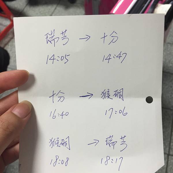等朋友体检回来,吃完午餐,因为晚上宿九份,我们拉着行李箱开启新的旅程。 台湾地势的原因,东行目前没有高铁,但有很多短途区间的火车线路,车厢很复古,值得体验。 从台北车站坐到瑞芳的火车,行程大概1.5-2个小时左右(途中会经过一个暖暖车站,下车拍照要非常快),去平溪和九份都在瑞芳火车站下车,不过两个景点在完全不同的方向~我们是先玩平溪线,傍晚再去九份,因此需在瑞芳站寄存行李。 顺着车站的指引就能找到寄放行李的地方,行李处的大叔人超级好,给了我们建议,还帮我们列了最优行程,又怕我们错过班次把规划时间都写给我们。 平溪线:包括猴硐、十分、平溪、菁桐等景点。持有一日券的游客可以在一天内无数次往返上下车,票价为80新台币一张。平溪线的火车是一小时一班。(但是像我们下午才去的玩不到几个点的就没必要排队买一日券,刷悠游卡就可以了) 九份线:从瑞芳火车站出来就有客车去九份,但不是瑞芳车站门口的那个车站,要往左走一段路~瑞芳到九份的客车大概15-20分钟,票价大概在15台币左右。复古的火车瑞芳站大叔给我们规划的时间