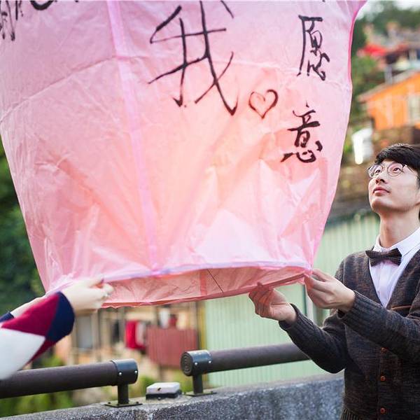 然而,计划总是赶不上变化~老远就看到的人山人海,让我们不得不放弃一大段平溪线的拍摄~然而并不遗憾,因为做足功课的亮哥,直接把我们带到沈佳宜和柯景腾放天灯的地方,去再现电影的场景~车站附近果然异常地热闹,各式各样的小吃,隔几步就有各式各样的天灯卖~人们总是说,当一个景点“商业化”后,便失去了它的本真~然而在这里,虽然多少有些商业气息,但感觉淳朴的民风和风景,并未被商业气息侵蚀~挑选了一家装潢很有特色的商店,买了个天灯当道具~拿着小学之后再没碰过的毛笔,写上“嫁给我“”我愿意”,“我宣你”“我造”~稚嫩得很,但是又可爱得很~拎着好不容易写好的天灯,来到男女主角放天灯的小桥上,一路得到了太多好心人的帮助~天灯店老板和发哥贴心地帮我们把碍事的机车移开,教我们点火~屠老师提前站到几十米开外的地方,随时待命捕捉远景~蕊姐拿着手机取好景,在放天灯的过程拍下小视频……点火后灼灼热浪袭来,短短几秒钟,天灯飞起,快门按下~是不是跟电影一样的取景已经不重要,整个过程就是在拍电影,不是吗?