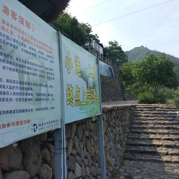 楠溪江的漂流点有好几个,有二桥、三桥等,我们选择了小港至狮子岩,单程收费, 1-5人收费分别为270元、280元、290元、300元、375元,1米2以下半票,不占座由大人贴身保护。 上竹筏前,岸边有红色的漂流提示牌,...