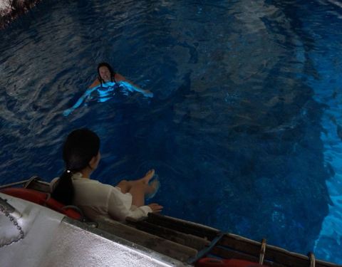 先坐上小快艇出发,先去沉船湾,返回的时候去往蓝洞,感觉他们都是在一条顺水的方向。快艇在海水前行,靠岸的一边有一些贫瘠的石灰岩山丘,也有许多深水湾和陡崖。到处都是蓝色,浅蓝、淡蓝、碧穹,天晴,清湛,水色,天河。。。真的会词穷的[]~( ̄▽ ̄)~*小快艇的好处就是可以进洞,只能直进直出,大小刚好够融合一艘小快艇,到洞里面就上空就是一片漆黑,水下透出蓝色的光,谜一般的蓝色,很美,很吸引人。建议:1.记得涂抹高倍翻晒霜,墨镜也不可少。
