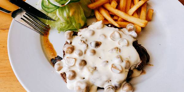 招牌牛排,性价比超高,五分熟牛排配蘑菇酱,棒! - ...厅,有室内和露天座位,环境可以,菜品有奶酪披萨,意大利面,河粉,春卷等,西式和越南式美食的结合