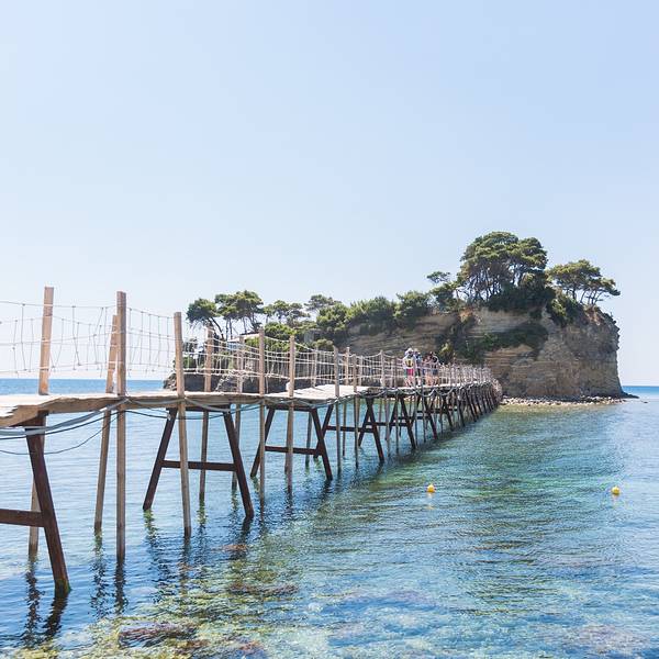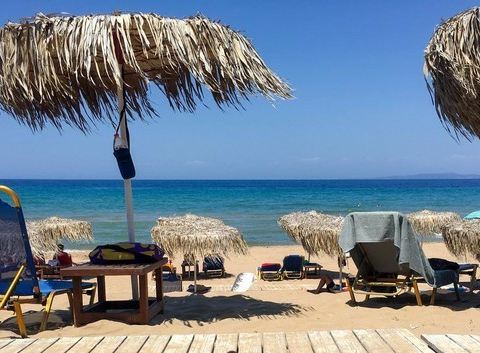 我们的下一站是Laganas beach拉 加纳 斯海滩 海滩有一排的店,各种吃的,还可以报名海龟岛半日游或者一日游活动 坐在这个海中椅子别有一番风味吧别人家里,住在这里有多幸福呀下一个目的地就在这个海滩边上,Cameo Island ,上去需要门票,我们就没上去了,就过去拍了点照片就撤回了吊桥地下的海水清澈见底,好多的海胆中午就在沙滩旁的一家小店吃午餐吃完午餐我们导航去看最美的蓝沟了 大家导航Korakonissi就可以到达了