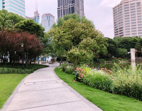 绿化面积很大,平时人不多,周末和晚上散步的人不少延中绿地坐落在人民广场附近,靠近淮海路和黄陂南路,有喷泉,周围是高架。绿化面积很大,平时人不多,周末和晚上散步的人不少。