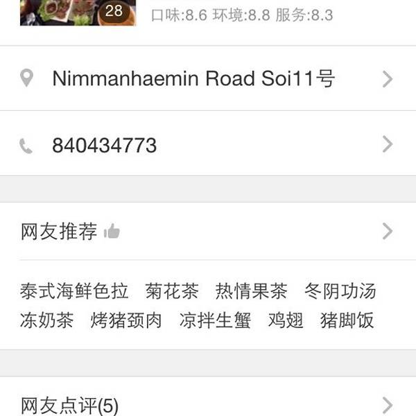 → Somtum Yokkrok(宁曼路) → 餐厅在Mango Tango附近,一栋白色的建筑给一片充满绿意的院子所环抱,用餐的环境也非常清新,炎炎酷暑下看到生蟹立马来了食欲,还有这里的猪脚饭也很棒,值得推荐! → 人均消费...