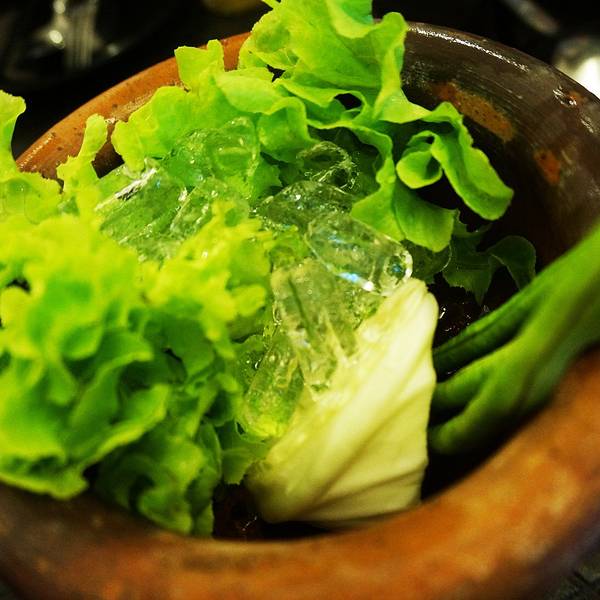 ...一起,旁边的加了冰块的蔬菜可以蘸里面的酱汁一起吃,我们第一次吃生的豇豆,口感有点甜甜的,很不错