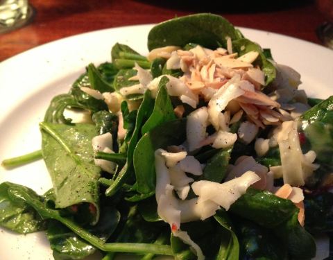 Awesome spinach salad!!! Cheese + almonds + mushrooms + bacon mmmm yummmmm. SUPER worth the $10