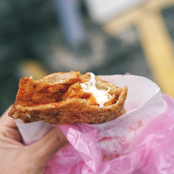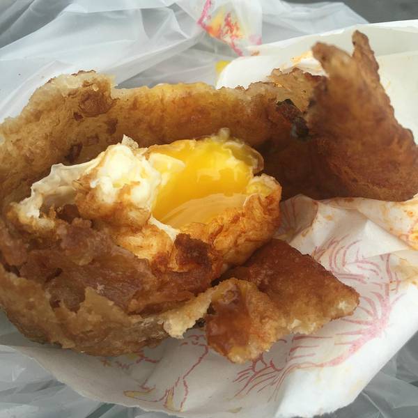 葱油饼是花莲的经典小吃。炸蛋葱油饼就是炸流心鸡蛋与葱油饼的结合