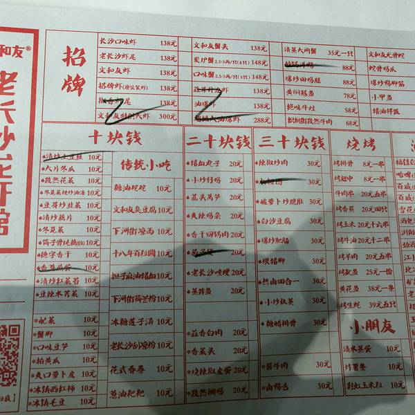 据称海信广场这家店是亚洲最大龙虾馆,哈哈哈。所以前来打卡,11点开门,我们10点半到,多亏来的早,不然有的等了。门外大火盆烤火。门外楼上楼下这是必点,长沙龙虾是和川味虾不一样,湖南人不吃麻,这辣是杠杠...据称海信广场这家店是亚洲最大龙虾馆,哈哈哈。所以前来打卡,11点开门,我们10点半到,多亏来的早,不然有的等了。门外大火盆烤火。门外楼上楼下这是必点,长沙龙虾是和川味虾不一样,湖南人不吃麻,这辣是杠杠的我吃了一个就放弃了,喜欢吃辣的可以来尝尝,和麻辣小龙虾是另一种感觉。最后奉上点菜单,来时想好吃什么!耶。。。。。。吃完饭结束本次出行,前往长沙站回岳阳。回来火车坐的18号车厢,来的时候车头,回的时候车尾,这确实算是有头有尾完整得很呀。整个行程由于下雨略显松散,再加上这边一下雨就是连阴雨,给出行带来了很多不便。