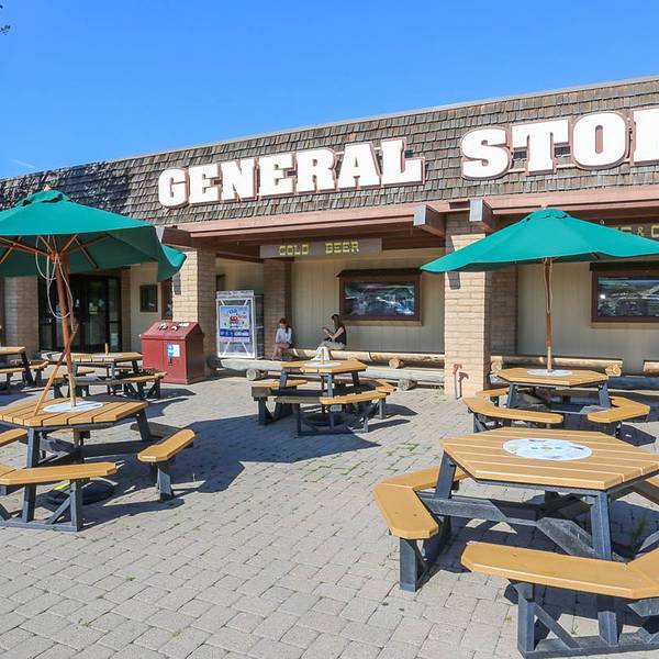 南缘的设施相对完善,GENERAL STORE是个很具规模的超市,超市里一半是食品一半是纪念品,食品的种类比较全,几乎能买到关于露营的所有东西,帐篷、睡袋、衣裤鞋帽、木材、餐具以及各种生鲜蔬菜,还有bbq的炭和篝火用的柴火。超市外面有个卖面包汉堡沙拉的柜台,我们在超市里卖了烤鸡切块水果和饮料做午餐,为避免心虚就在柜台买了一盒沙拉,然后正大光明地围坐开吃起来。