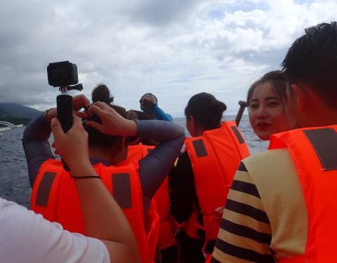 在观看鲸鲨的位置,有一只专门投食的小船,吸引鲸鲨跟着船,在游客船前面,方便大家观看。大家观看的时间15分钟左右,然后调换其他的游客。旁边就是苏米龙岛,一岛一酒店,我们就没有选择了。