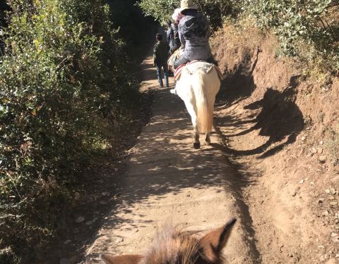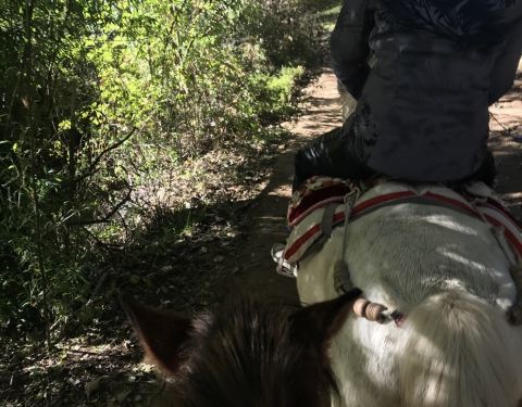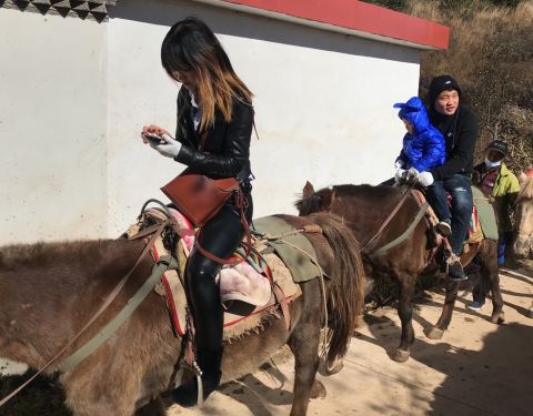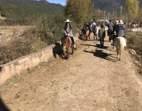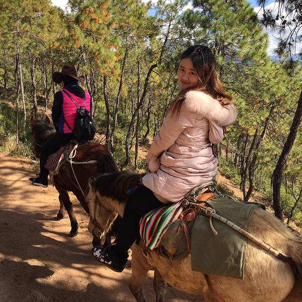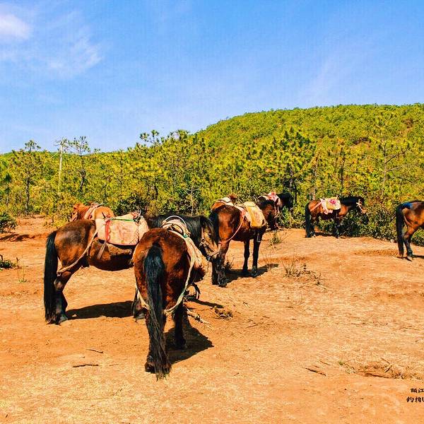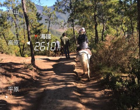 如果骑马,一定要戴手套,避免手磨泡,如果没带,马场可以买,5块钱一副。第一次骑马,有些紧张,记得电视上讲过,其实骑马应该是蹲姿,但是看周围的人都是坐在马背上,然后我也纠结该按谁的套路来。套餐上说的是走茶马古道,也就是说需要翻山,有些地方还是蛮陡峭的,所以在马背上还是很紧张的,时刻紧握着缰绳,手还抽了一下筋。牵马的小帅哥很是风趣幽默,一路上一直讲笑话调节气氛,其实蛮佩服他们的,因为全程2个小时,他们是一路步行,跟着我们爬山钻树林,而且一天几趟,很是辛苦。唯一需要吐槽的就是中途休息的地方,会卖玉米粒,5块钱一盒,喂给马吃的,可是太少了,一点都不耐嚼。