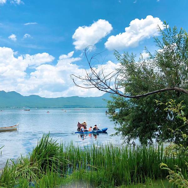 天气好景色还是不错的,蓝天白云。,云南的天气就是动不动就给你沐浴一场!哈哈!🤣今天最少被淋了三次雨了,不过还是挺舒服的,排队划双人船的人超级多,最少排两个小时以上…