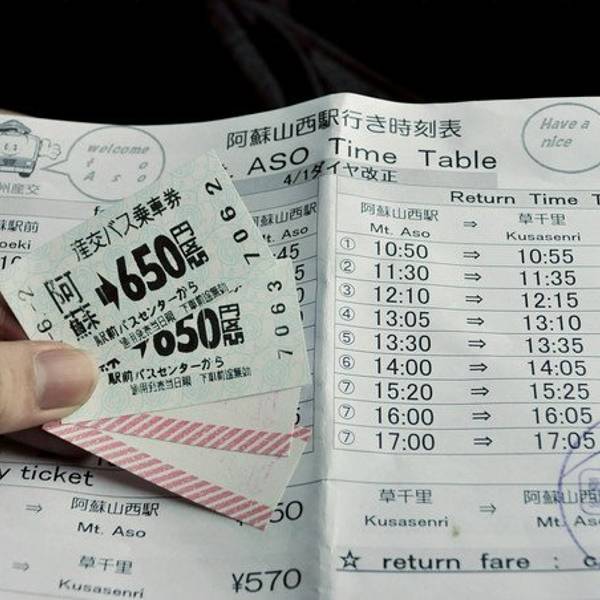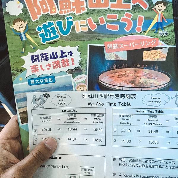 由于熊本地震的原因,造成了熊本到别府之间的JR线路中断 时至今日竟然没修好……我真的无法理解,竟然就不修了? 然后还造成了经典的特别列车阿苏BOY也只能去跑别的线路…… 因此,从熊本出发去阿苏火山一日游,再去别府成为了这次旅行线路上最重要解决的一环 研究了半天,才明白从熊本到阿苏火山,有两个公司的巴士在运营 但是推荐大家的只有一班巴士,就是早上8:04分从熊本站出发,10:00抵达阿苏站 之所以,选择这一趟巴士,是因为能无缝对接阿苏站去阿苏火山的观光巴士, 因此,如果不是乘到这一趟车,我可以很负责的说,这一天的行程就全部泡汤了…… 这就是日本的交通模式,很多偏僻的地方不能错过,不然就是延误一天……正因为绝不能错过,7:30分我就跑下楼赶紧吃了早饭,然后7:50去办理退房手续 然后,赶紧去站台等着了,值得庆幸的是,日本的巴士真的是非常准时的 车门一开,司机师傅拿出一个名单对照已经电话预约的姓名 因为,我是没有预约的,所以最后才轮到我, 还好这个时间段坐巴士去阿苏方向的人并不多,因此位置还是比较空的由于路上比较的拥堵,因此巴士抵达阿苏站还是晚点了 一下车就有观光巴士的阿姨赶紧跑过来,问我们是否要去阿苏火山 赶紧答应了,然后飞速的把箱子去寄存完毕就跳上了巴士 下图就是观光巴士的具体时间表,也是一天两班车…… 我建议的就是和我一样10:15分出发,玩个阿苏火山口和草千里之后 坐15:00的最后一班车返回阿苏站,然后坐16:20分,最后一班的九州横断JR去别府 只有,这一种选择才是目前自助行,完美从熊本出发阿苏火山一日游后去别府的最佳方案