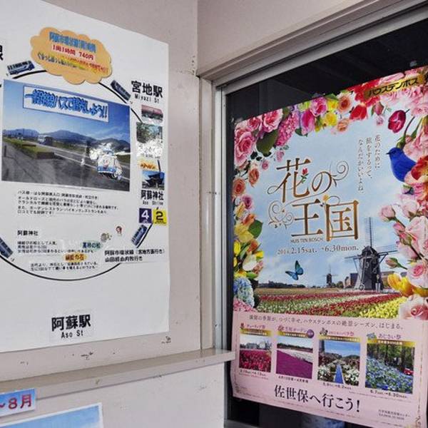 9.43, “九州横断特急2号”准时到达阿苏站,出站右手边就是“观光案内所”,急切地搜索着去阿苏火山的巴士信息,最近班次是10.05,买好票后(单程650/张),还没来得及欣赏阿苏站,巴士就来了,去阿苏火山的不到...