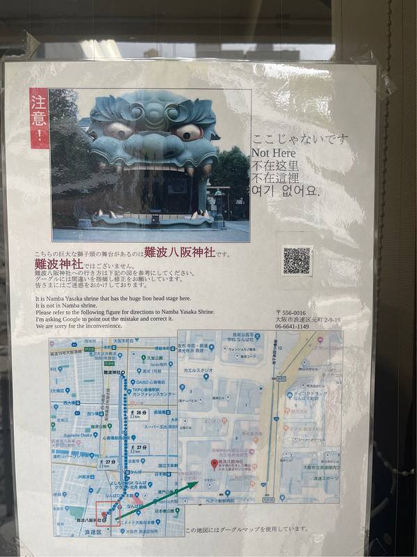 这里是南波神社,有狮子头的是南波八阪神社狮子头并不在地图标记的地方,神社里专门贴了告示,不要跑错了。
