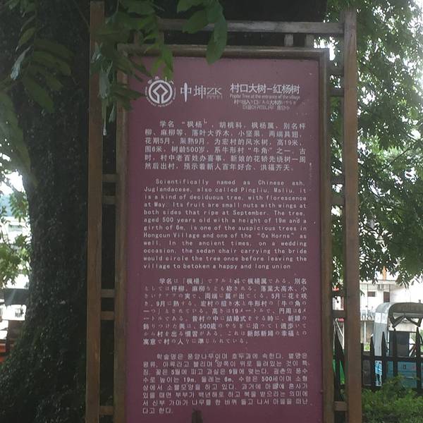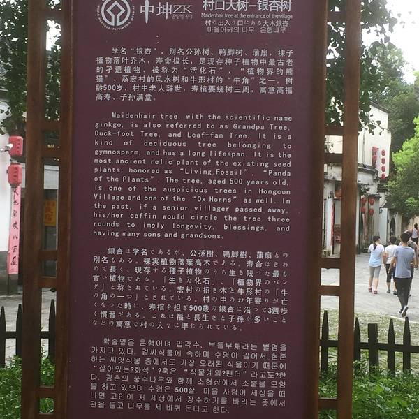 跑去宏村游玩, 最先映入眼帘的就是这两棵大树。 没想到这树被比作牛角, 守卫着整个村子。 古树很有些年代, 据介绍树龄都500岁了, 真是厉害。 照这样推算, 应是明朝就栽种的, 日晒雨淋的经历, 魏然屹立不倒, 感觉很有气势。 看这树很大, 树荫也很密, 在树下感觉还很阴凉。 幸好去的时间早, 还没有什么游客。 等早上10点后大批游客涌来, 都争相在树下拍照, 感觉根本没有机会好好拍张树的全像了。 这树据介绍还被称为风水树, 讲究风水的, 将其视作风调雨顺, 万事平安的象征。 看来树下许愿的人也有。 看这树一棵是红杨树, 另一棵是银杏树, 两棵树都各有讲究。 红杨树据说是村中老百姓办喜事的话, 新娘花轿先要绕树一周后再出村, 预示着新人百年好合、洪福齐天。 作为游客, 也就绕着瞎转, 希望带好运了。 另一棵银杏树, 据说村中老人走了, 寿棺要绕着树走三圈, 寓意高福高寿, 子孙满堂。 但是貌似环绕的方向有讲究, 不是随便什么方向都可以的, 这个就比较复杂, 因为自己也是路过的游客, 不清楚这些规矩, 想想还是算了。 再说是寿棺绕树, 有点阴森的感觉。 不过印象中银杏树一直是高寿的象征, 这点还是比较切实的。