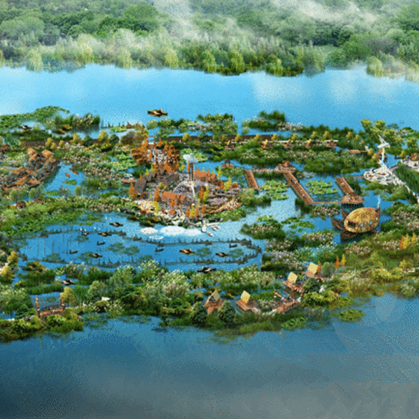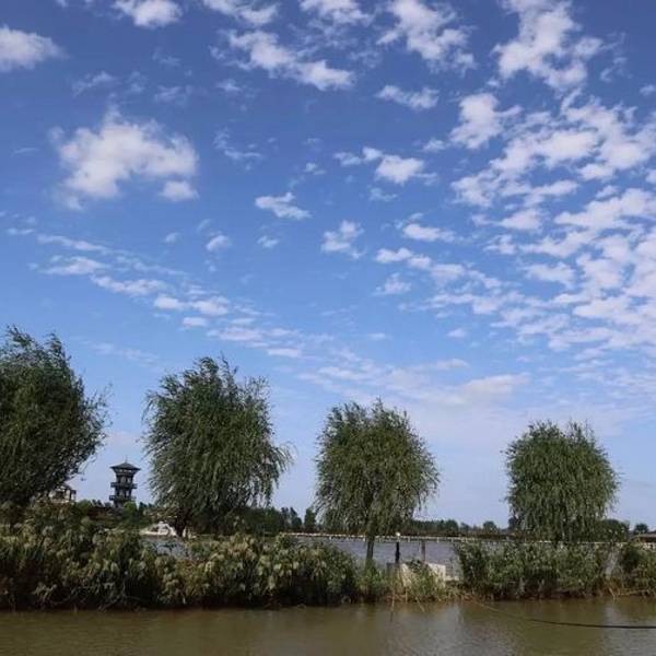 云浮半空,白鹭嬉戏,鱼翔鸟唱。林荫道上人来人往
