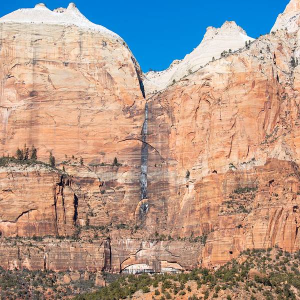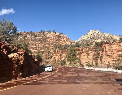 2月中去的时候,气温较低,尚有积雪,也正因为如此,为这个国家公园披上了一层白茫茫的亮色。刚进公园门口就看到的棋盘山,整个山体都是白茫茫一片,把"棋盘"格子完全覆盖住了。 车子开往Zion的路上,车窗外两侧白色一片,配上阳光、蓝天和白云,给人以素静而又有生机活力的感觉。Zion是露营、徒步和攀岩爱好者的天堂。攀岩的山体笔直,真佩服那些老外。