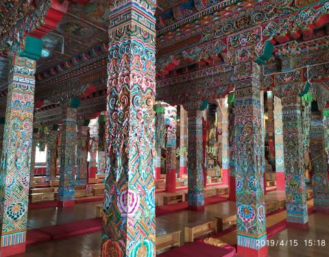 ...的大殿所有的支撑木柱进行雕刻,今年开始了彩绘,现在有百多名的画工在大殿里工作,非常值得一看藏画