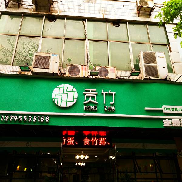 贡竹餐厅位于同兴路新桥附近,旁边是一家KTV。招牌比较显眼,因为是绿色的竹子主题餐厅。店内面积大约110m2左右,在店门前有一个烧烤架子,上面是烤兔。一只76元,半只40元。店内装饰以清淡、绿色为主。设有吧台...
