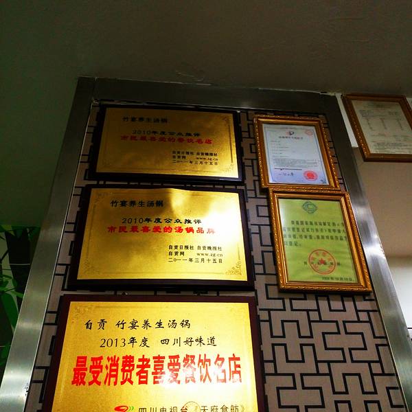 贡竹餐厅位于同兴路新桥附近,旁边是一家KTV。招牌比较显眼,因为是绿色的竹子主题餐厅。店内面积大约110m2左右,在店门前有一个烧烤架子,上面是烤兔。一只76元,半只40元。店内装饰以清淡、绿色为主。设有吧台、制作间、配餐间。墙面的装饰图案新颖靓丽。悬挂的液晶电视没有打开。在吧台身后的柜子上摆放着许多的熊猫玩偶,很不错。这家的汤锅分为煮和烤二合一。我们上的菜有水晶牛肉、黄叶耙、菌类拼盘、乌鱼、罗汉笋、夯兔、海带。分量足够3个人的了。这家的蔬菜比较便宜,大约是几块钱。但是竹笋类一份就要少的12元,多的20元,不太划算。配料蘸碟是三味,小米辣椒、野山椒、香菇酱。选择更多一些。都好吃。这家的兔肉是论两卖的,一两兔肉2.8元。这个价位比较划算。配置的鲜锅汤比较好喝,味十足。店内装饰环境总体布局不算很好,但是也不差。如果能改进桌椅和用餐器具会更好一些。牛肉特色可以用烤的来实用。这个是一个特色。温馨提示:1:乘坐9路、37路、2路、6路在新桥站下车步行15米就是贡竹主题餐厅。2:人均消费大约为40元左右,算划算的。3:特色菜品推荐兔肉和竹笋。4:营业时间:10:00-21:00.5:店铺周围环境:同兴路可谓自贡地区吃喝娱乐一体的地方,约上朋友吃晚饭后可以去KTV或者茶坊打麻将。走路就能到达下一个娱乐地点。餐厅地理位置很好。5:店内服务还是不错的,有什么需求可以直接向老板提出来,上菜速度也是可以的。6:推荐指数(满分5星):3星。希望能推出更多的新品。