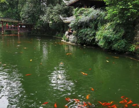 崇州罨画池太美了,小巧的庭院,悠久的历史 ,浓厚的文化氛围。和陆游祠和崇州文庙挨在一起,庭院中水池里数量和个头都惊人的锦鲤色彩斑斓,在绿池中游动,简直就是一幅浓墨重彩的油画。高大的银杏楠木遍植院中,...