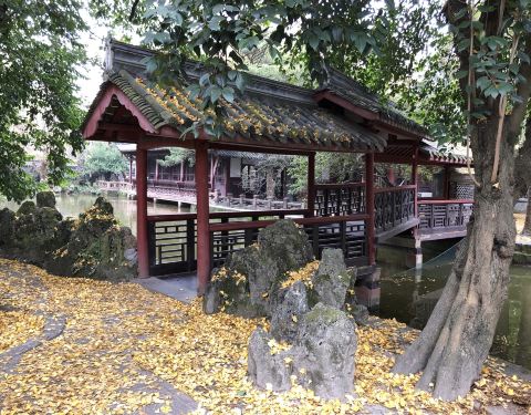 到崇州总是要到罨画池去看看,那里一年四季风景如画,各个季节美景不同,最美的季节就是在当下的秋冬时节。近日的罨画池层林尽染,各种树木的色彩是如此的缤纷绚丽,罨画池里古树名木众多,参天的大树有楠木、银杏等等,树龄百年以上,金黄的银杏叶随风飘落,湖中、地上、房顶上到处都有金灿灿的银杏叶子,如诗如画般的美景吸引着无数的市民和游人前来观赏。