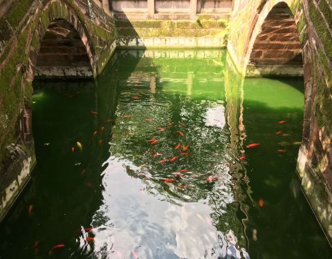崇州罨画池太美了,小巧的庭院,悠久的历史 ,浓厚的文化氛围。和陆游祠和崇州文庙挨在一起,庭院中水池里数量和个头都惊人的锦鲤色彩斑斓,在绿池中游动,简直就是一幅浓墨重彩的油画。高大的银杏楠木遍植院中,秋天来游定是另外一种美景!