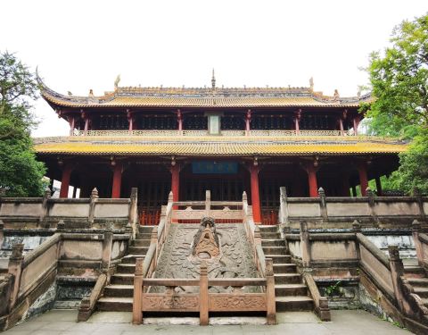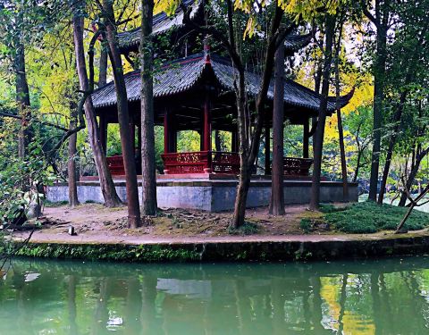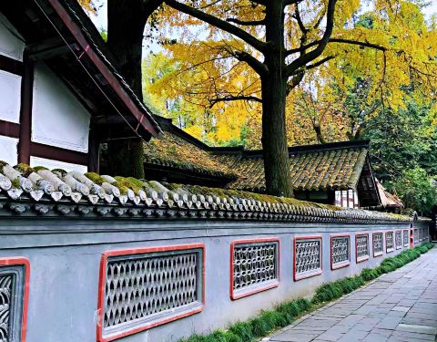 罨画池位于崇州市,是四川园林中川西园林的代表作之一,全国重点文物保护单位。罨画池园林始建于唐朝,初名“东亭”,是一座衙署园林。北宋赵抃受邀来游时,东湖已名为罨画池。加之后来苏轼的孙子苏符任职蜀州时的增建以及陆游等文人的经营,成为蜀中名胜。全园由罨画池、陆游祠和崇州文庙三部分组成。每当秋季银杏黄了的时节,园中景色更佳。
