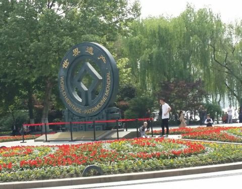 涌金门是杭州十大古城门之一。 据说五代吴越国时期,为了引西湖水入城,开了这个涌金门,以前还有水门。 不过现在就是个遗址啦,这里成了涌金公园。 新造的涌金门石碑立在南山路边,背后刻了相关的历史。 涌金广场中间立了世界遗产的标志,这里还经常办一些活动。