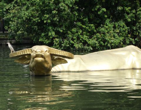 看到水里的金牛上站立着一只鸟,起初还以为是假的,仔细看了原来是真的!真的是以假乱真了