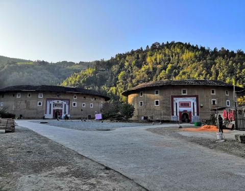 河坑土楼群,由15座不同造型的土楼组成。这些土楼气势恢宏,分布在“丁”字形的小河流两岸的狭小地带。居高俯视,偌大土楼群星罗棋布于青山秀水之间,给田野平添了一道壮丽的景色(1617年—1623年)的朝水楼(1699—1702年)的方形绳庆楼。楼内祖堂上悬挂着清制的“德式乡闾”牌匾,堂内有木雕“狮子夯梁”,墙壁有梅、兰等花草图案彩绘。俯瞰全景土楼左侧土楼右侧河坑土楼群以“法天象地”作为规划布局理念,14座方圆土楼一次规划分批建设,单体土楼采用夯土墙与穿斗式架构共同承重的方法建成两层以上封闭式围合型民居建筑。楼群坐落于不足1平方公里的山地溪畔间。河坑土楼群从建成至今,除了正常检修外,14座土楼墙体、结构、内外空间一直维持原状,没有任何改变。 展开