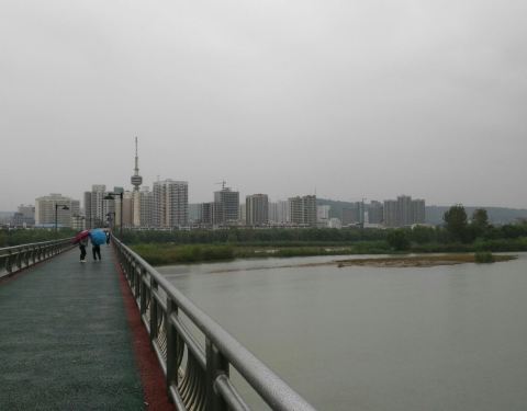金渭河上的索道桥,走起来有些微微的晃动,严重恐高的人估计会很不舒服,站在桥上看水流,也是有些眼晕,很有趣的体验。必须说,宝鸡的渭河沿河区域的改制建设还是很有成果的。 住在渭河沿河的居民真是有各种的公园走路的体验了。