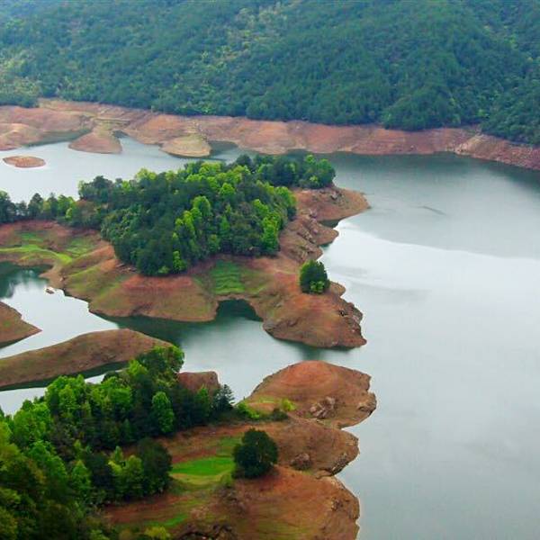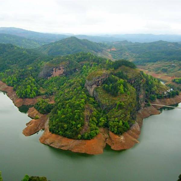 此时的大金湖湖面,泛着些许的轻雾,一汪碧水,波澜不惊,显得很柔美,山峰倒影在水中,如梦如幻,岸边的红土台地,曲折蜿蜒,色泽鲜艳,与翠绿的植被,形成强烈对比。 展开