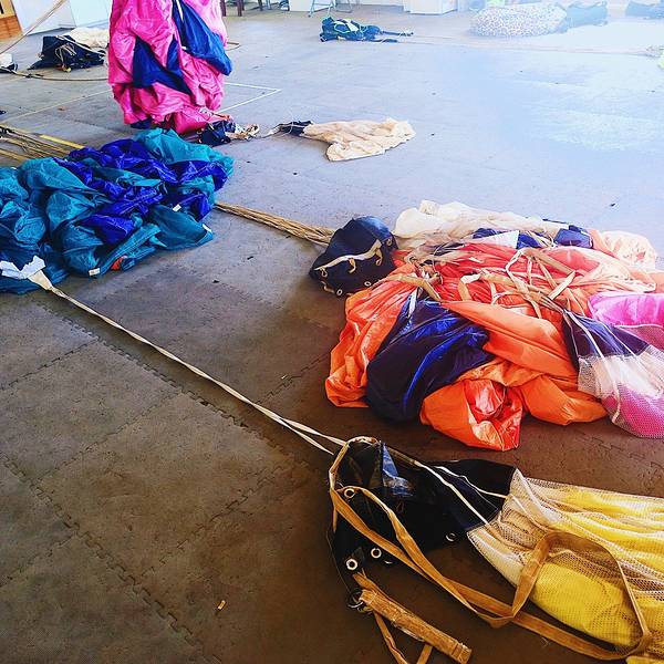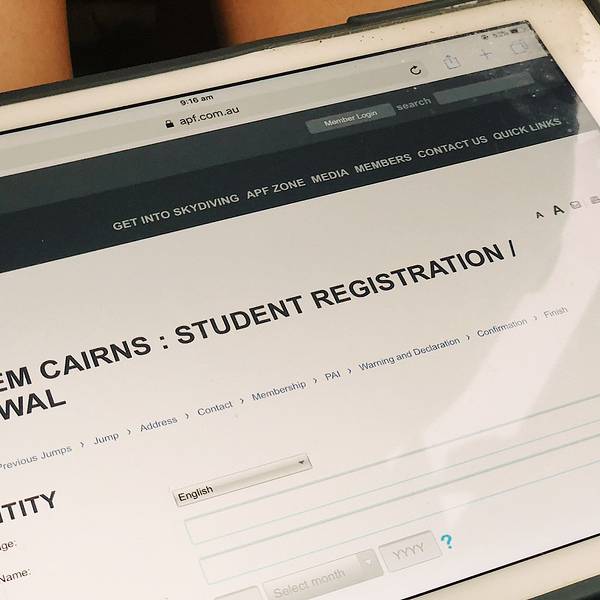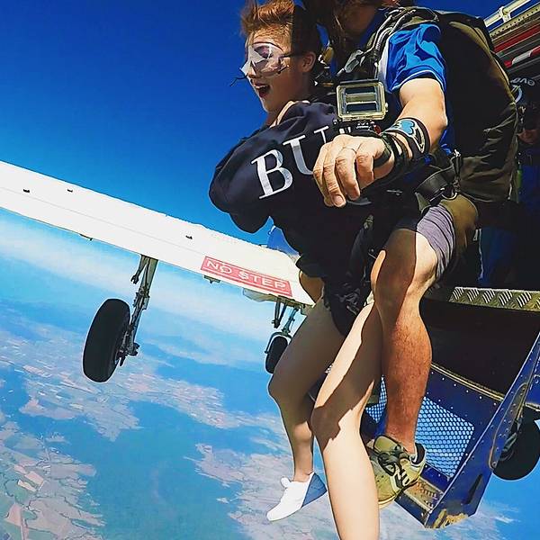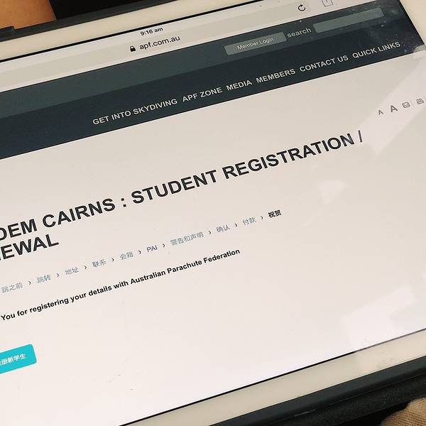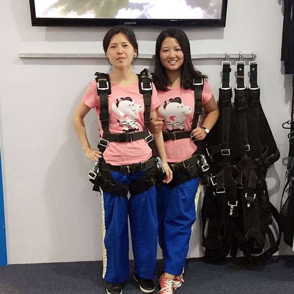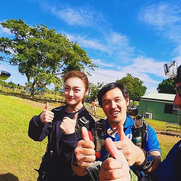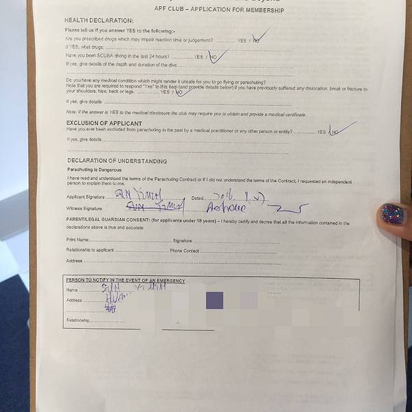 从下降到落地的全程,我几乎都没舍得闭眼,想好好纪念我的first skydive,其实跳伞并没有那么恐怖,但是真的很酷!🆒 再加上后续发的15000英尺高空跳伞证书,不能再棒的体验!!我的跳伞证书+jumpers纪念T恤突发奇想,下次跳伞是不是可以挑一个彩虹色的伞包~跳伞前,会让你填写这样一份跳伞须知,里面标明了责任归属,还有一项对自己生命安全负责的条款,填写完大概10分钟吧,这时候,电子屏幕会开始放注意事项和跳伞动作要点,一定要注意听讲,不然降落的时候,动作不规范是容易受伤的,再加上教练的语言沟通问题,所以还是认真学习一下为好与我同行的姐妹们,从右至左:佳妹、怪哥、怪妹,(在此特别感谢摄影师侯帅哥哥,供图我怪哥)“We are skrrrrrrr~” 展开