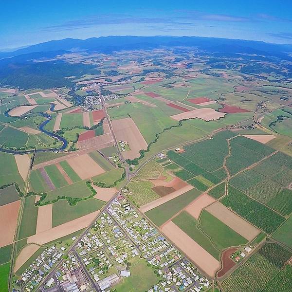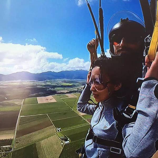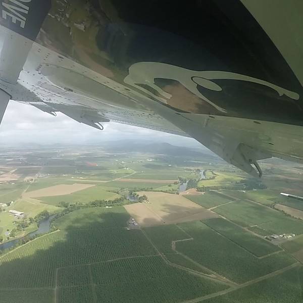 还没等我欣赏够,凯文一个猛子,我们就"浪漫"的skydive了,整个下落过程真的太疯狂了,睁眼时已是在一片无尽蔚蓝中......我尝试着张开嘴,想说那句本来准备跳伞瞬间说的话i`m free!,但滑稽的是一张开嘴,就灌满了风,我都能想象到风在我嘴里咕噜咕噜的模样,想了一想,我花了那么多钱录像,算了算了,形象最重要!心里默念就好了!急速下降了大概十几秒,凯文拉动了伞包,一股强大的拉扯力,把我向上拽,肾上腺素在这一刻几乎爆棚,那是一种像飙车在地狱 通道 的快感,随即而来的是平静,那是一种只能听见心跳的静,我们停止了降落,我像是一个绑了气球的泰迪熊,开始了我的空中漫游,在 凯恩斯 的上空俯瞰 大堡礁 与农庄,真的是太美了,蔚蓝的海岸线像是地球用蓝宝石镶嵌的边框,不同色块的的田地像极了手工编织的拼接的羊毛地毯…以为跳伞这个过程是像jumping一样完全快速的,但不是的,在降落伞撑开的时候,你可以尽情的享受眼前的美景,你会讶异的说不出话来,amazing!就只是享受就可以了,享受风的呼啸,享受自由的味道。