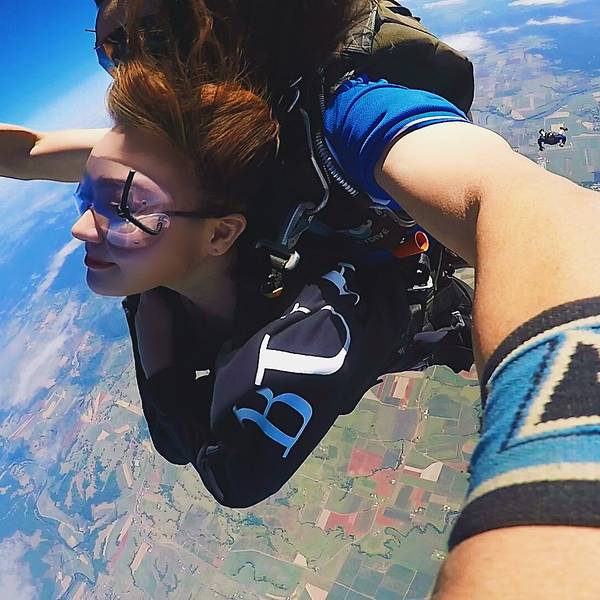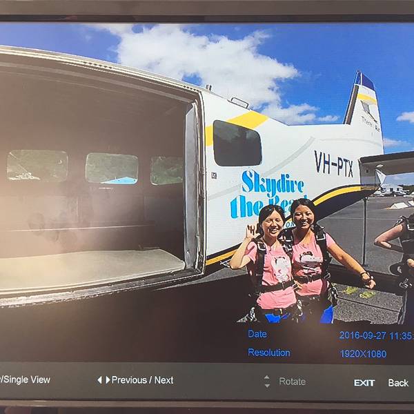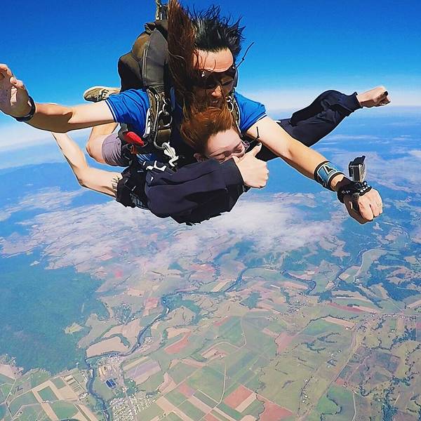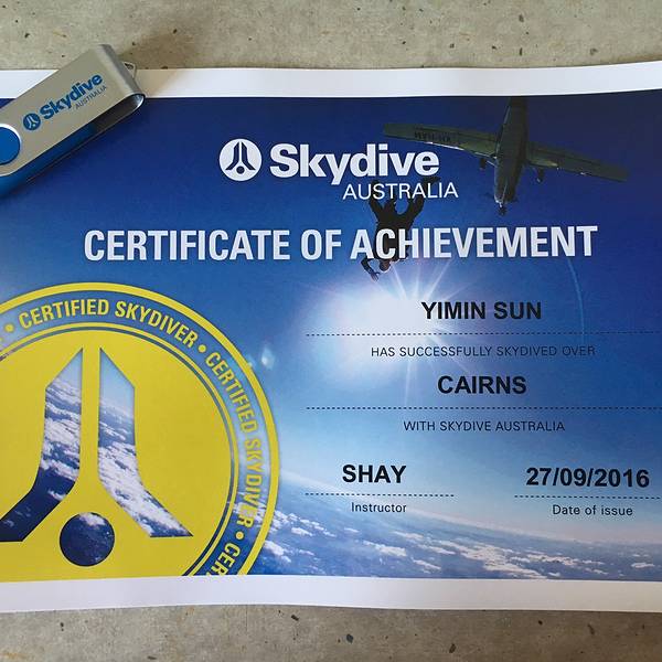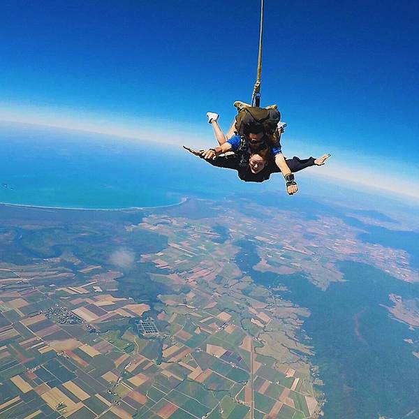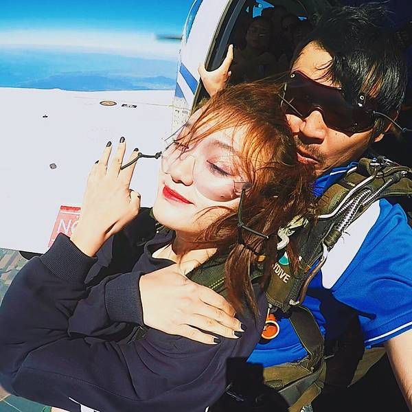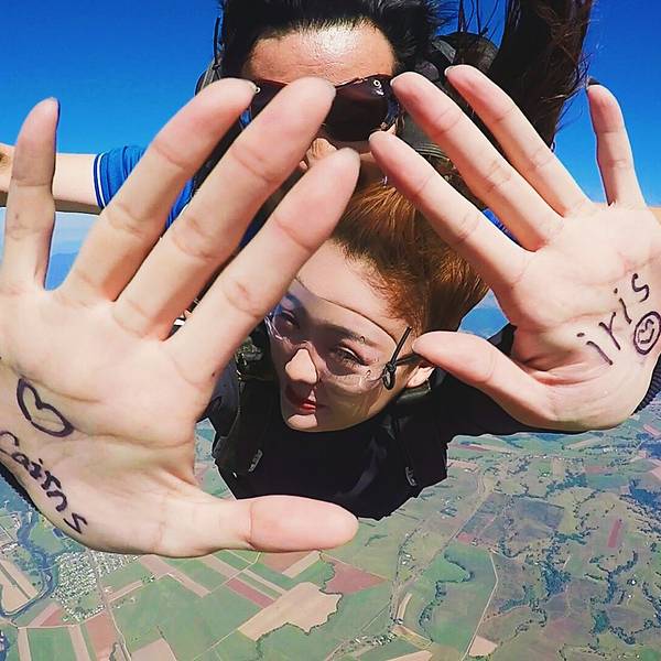 ...美了,蔚蓝的海岸线像是地球用蓝宝石镶嵌的边框,不同色块的的田地像极了手工编织的拼接的羊毛地毯…我自知是一个最像火象星座的摩羯座,虽然固执的像头牛,但一点不影响我喜欢未知的新鲜和刺激感,跳伞这项极限运动在我的to do list上已经提名很久了,可以说这是其次澳洲之行最大的期待了。除此之外的小心机就是...我自知是一个最像火象星座的摩羯座,虽然固执的像头牛,但一点不影响我喜欢未知的新鲜和刺激感,跳伞这项极限运动在我的to do list上已经提名很久了,可以说这是其次澳洲之行最大的期待了。除此之外的小心机就是,省去直升机游 大堡礁 的钱,飞行足足20分钟呢,不得不说很划算哦!跳伞之前,录了一段vcr,凯文问我:你有什么想对你的家人和朋友说的,我回答:“亲爱的爸爸妈妈,这是我第一次参加跳伞,我一点都不害怕,还特别激动!希望有机会能带你们一起来,我爱你们!”但是现在回想起来,这个问题的初衷怎么那么像告别遗言呢......如果能重来,我要学李白,怎么也说的有文采一点,感动一点啊!你要问我跳伞前紧张么,说实话我真的不紧张,当飞机升到4000米时,飞机上的高度指示红灯开始闪烁,教练凯文问我:你准备好了么?你将从15000英尺坠落,这里相当于300层2米高的房子,我说:是的,我已经等不及了,让我像小鸟一样飞翔吧!跳伞不亲自去尝试一下,你真的不懂这种感觉,失重感远没有蹦极来的强烈,更多的是一种自由,一种征服蓝天的快感,这是我人生中的第一次跳伞,我不知道自己为什么会对这种极限运动感兴趣,但这种飙升的肾上腺素着实让人迷恋。打开舱门的瞬间,强烈的低温气流瞬间涌进,穿着短裤的我以体温的方式第一次接触了来自高空的信号,接着凯文推着我来到了舱门边缘,我几乎是悬空坐在空气中(凯文坐在飞机边,我和他绑在一起),我的双腿被风吹得不受控制,面对着无垠的天空,我第一次用眼睛直观的感受到地球球体的弧度,这真的太神奇了!