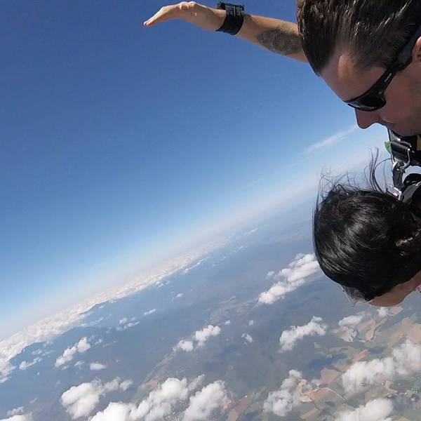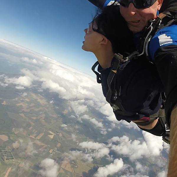 由于我和教练是绑在一起的,需要以仰卧的姿势(脸朝天空)跳出机舱。在脱离机舱的一刹那,由于地心引力的作用,身子便又翻了回来。下坠时的风像刀子一样硬生生的刮在脸上,尽管有眼罩的保护,仍是觉得十分难受。(所以回来看到照片后都认不出自己了)睁开眼睛后,整片大陆和海洋就这样赤裸裸的平坦在脚下,用最坦诚的方式来与你沟通。那个时候,我觉得生命是如此的渺小而又伟大。我真的词穷了,因为任何华丽的词藻都无法形容内心的那种感动。我们虽然是沧海一粟,却也是组成这个世界必不可少的一部分。